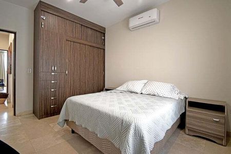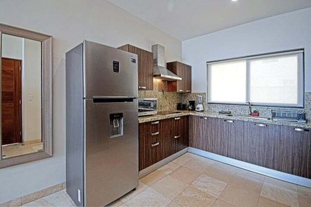 Pisos de mármol travertino en toda la sala y los dormitorios. Cocina totalmente equipada con estufa, microondas, refrigerador y muebles modernos. Comodidad con aire acondicionado a través de unidades mini split en cada dormitorio y en las áreas de sala/cocina, además de ventiladores de techo para una circulación óptima.