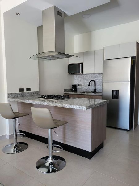 MALLORCA Condo Boutique, de estilo moderno contemporáneo a estrenar, ubicado en el tercer piso, tiene dos recamaras, dos baños completos, sala, smartv, comedor, cocina integral totalmente equipada, isla, cubiertas de granito, campana digital, aire acondicionado.