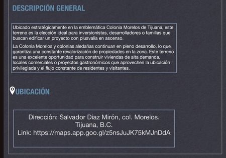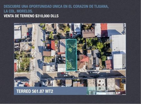 Se vende terreno en la Col. Morelos de 560m² en una de las zonas más estratégica de Tijuana.$250,000 USTerreno listo para escriturar.Agenda tu cita hoy mismo